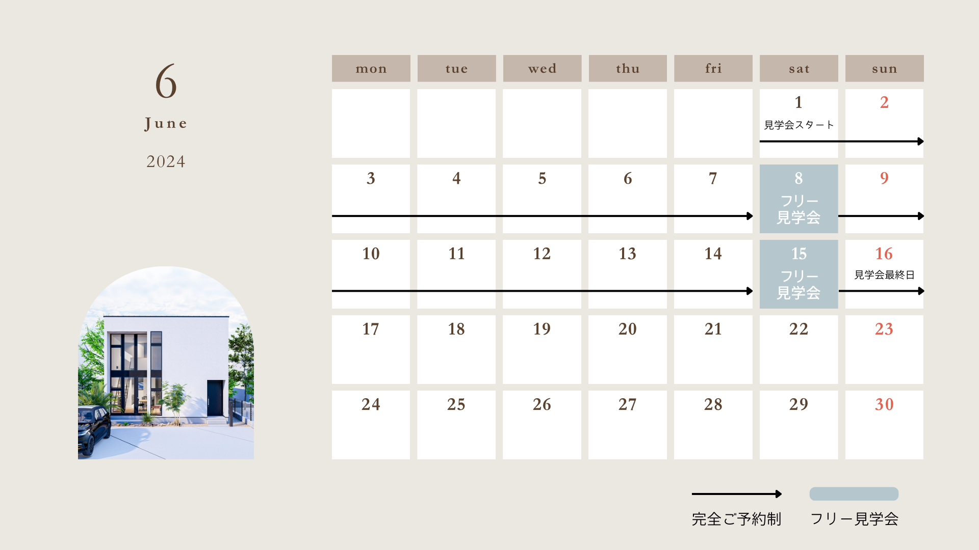 6 / 1 (土) ~ 6 / 16 (日) 完全ご予約制 ※6 / 8 (土)・6 / 15 (土) のみフリー見学会。